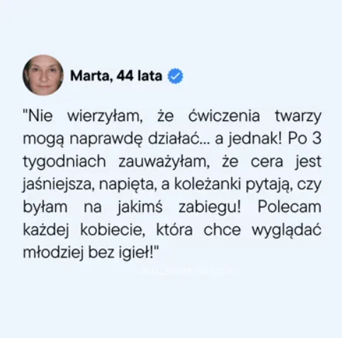 przez lata próbowała różnych kremów i maseczek, ale nie widziała większej poprawy. Unikała zabiegów inwazyjnych, bo bała się igieł i sztucznego efektu. Kiedy usłyszała o jodze twarzy, podeszła do tego
